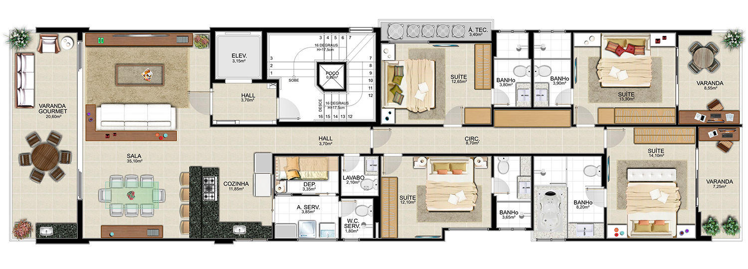 Apartamento com 4 suítes, sala ampla e varanda gourmet de frente para o mar.